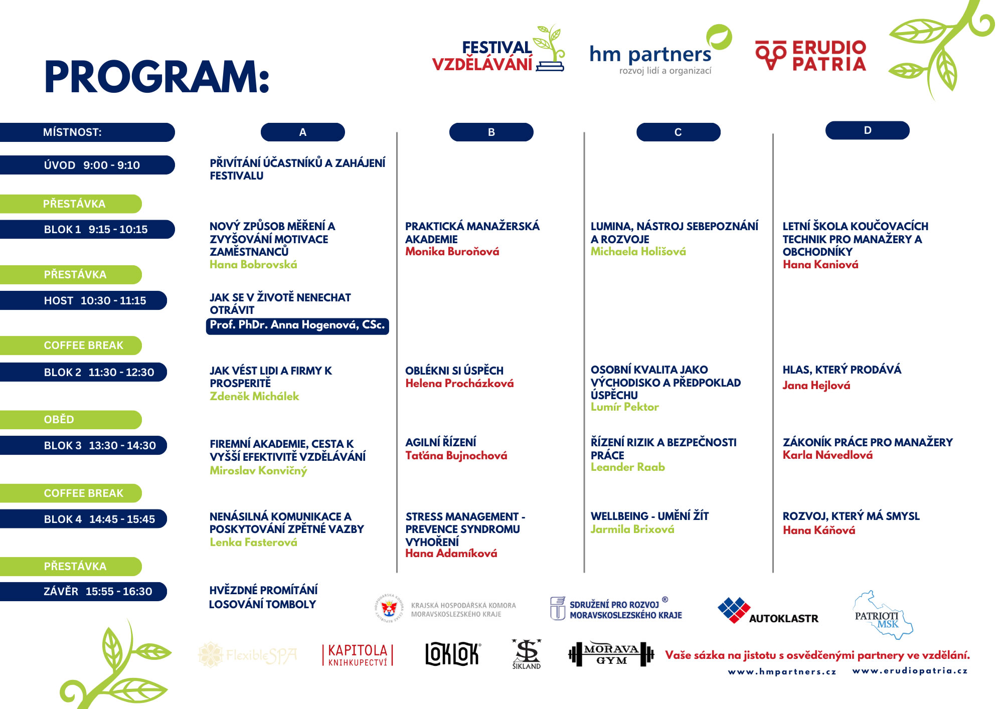 Co vás čeká? Bohatý program plný aktuálních témat, přednášek a diskuzí od předních lektorů společností HM PARTNERS a Erudio Patria.